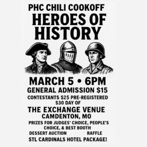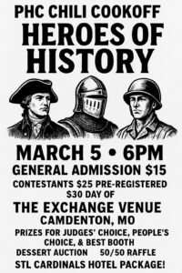 It’s time for another PHC Chili Cook-off! Join us at the beautiful Exchange Venue in Camdenton (57 Court Circle SW) Thursday, March 5th for a fun evening with food, prizes, and desserts! Theme this year is: Heroes of History.